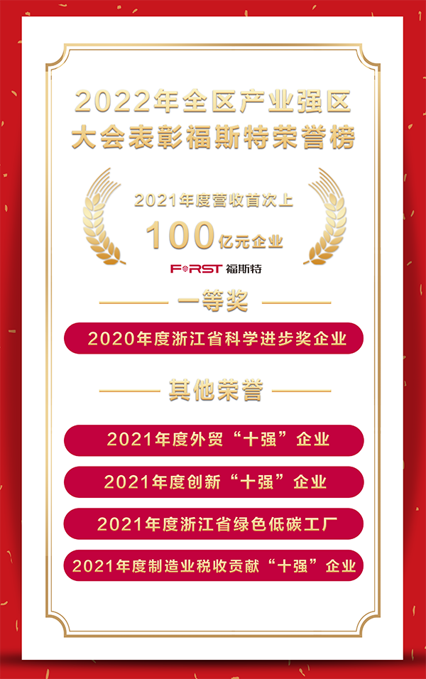 2022年3月21日上午,2021年度臨安全區(qū)產(chǎn)業(yè)強(qiáng)區(qū)大會(huì)隆重召開,福斯特榮獲2021年度臨安區(qū)首次營(yíng)收上“百億企業(yè)”、“制造業(yè)稅收貢獻(xiàn)十強(qiáng)企業(yè)”、“外貿(mào)十強(qiáng)企業(yè)”、“創(chuàng)新十強(qiáng)企業(yè)”等四項(xiàng)榮譽(yù)。此外,福斯特獲2021年度浙江省綠色低碳工廠、2020年度浙江省科學(xué)技術(shù)進(jìn)步一等獎(jiǎng)受到大會(huì)表彰。董事長(zhǎng)林建華代表公司參加頒獎(jiǎng)儀式,并作主題交流發(fā)言。