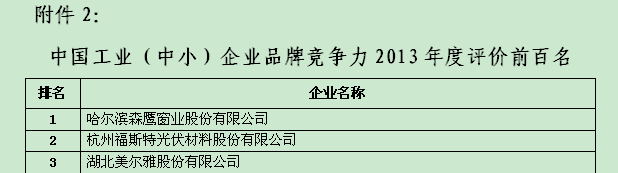 福斯特被評為“中國工業(中小)企業品牌競爭力2013年度評價前百名”第二名