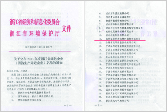 根據《浙江省創建綠色企業(清潔生產先進企業)辦法(試行)》,我公司在自主申報的基礎上,依次通過臨安市經信局、環保部門預審推薦,浙江省經信委、環保廳專家組復審及社會公示,被正式授予該榮譽稱號。
