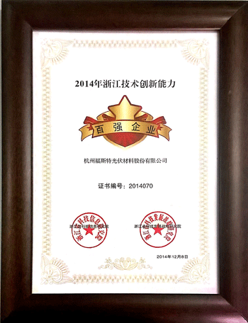 日前,福斯特榮獲由浙江省科技信息研究院、浙江省科技發展戰略研究院聯合頒發的“2014年浙江省技術創新百強企業”榮譽稱號。