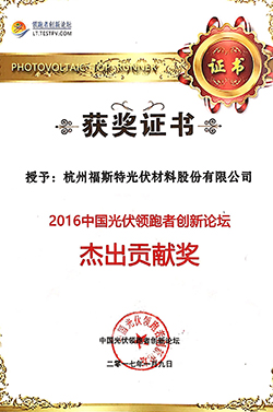 會議期間,福斯特榮獲中國光伏領跑者創新論壇頒發的“2016中國光伏領跑者創新論壇杰出貢獻獎”。此外,中國質量認證中心授予企業“國家能源太陽能、風能發電系統實證技術重點實驗室”首批榮譽用戶,福斯特光伏組件封裝用背板(BEC-301)通過中國質量認證中心(CQC)太陽能產品認證。