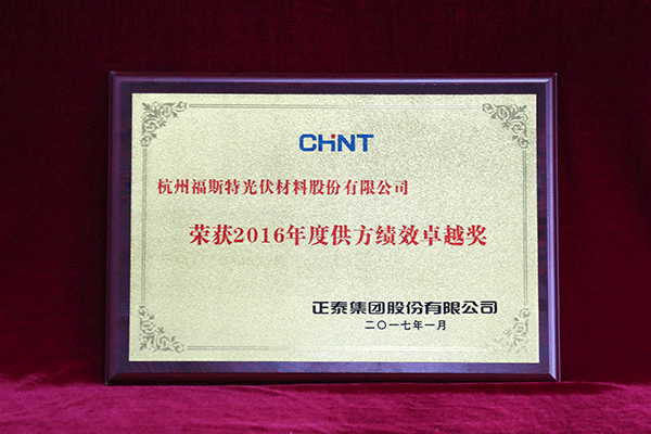 日前,福斯特榮獲正泰集團股份有限公司頒發的2016年度“供方績效卓越獎”。