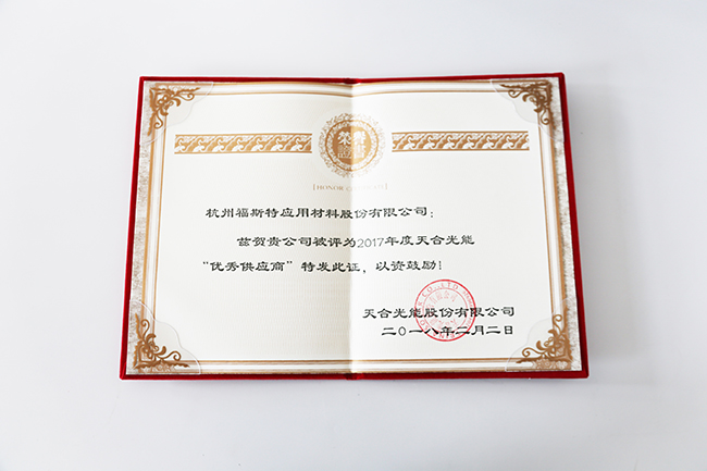 會中,公司榮獲2017年度天合光能優秀供應商獎。福斯特始終堅持“客戶第一”的宗旨,多年來為行業提供高品質的光伏封裝材料并得到了客戶的充分認可。契合了天合成就客戶、開放心胸、全力以赴、追求卓越的企業文化。