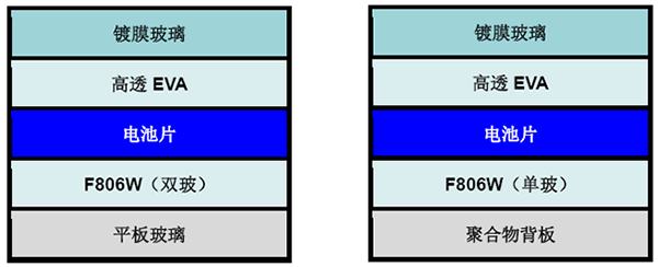 玻璃/高透EVA/F806W EVA/聚合物背板層壓件或玻璃/高透EVA/F806W/玻璃層壓件。